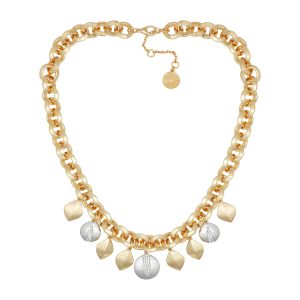 Featuring an eye-catching design with multiple gilded leaf charms in a mix of goldtone and silvertone. Finished with a secure lobster clasp closure. this necklace adds a touch of nature-inspired elegance and sophistication. making it a perfect statement piece for any outfit.